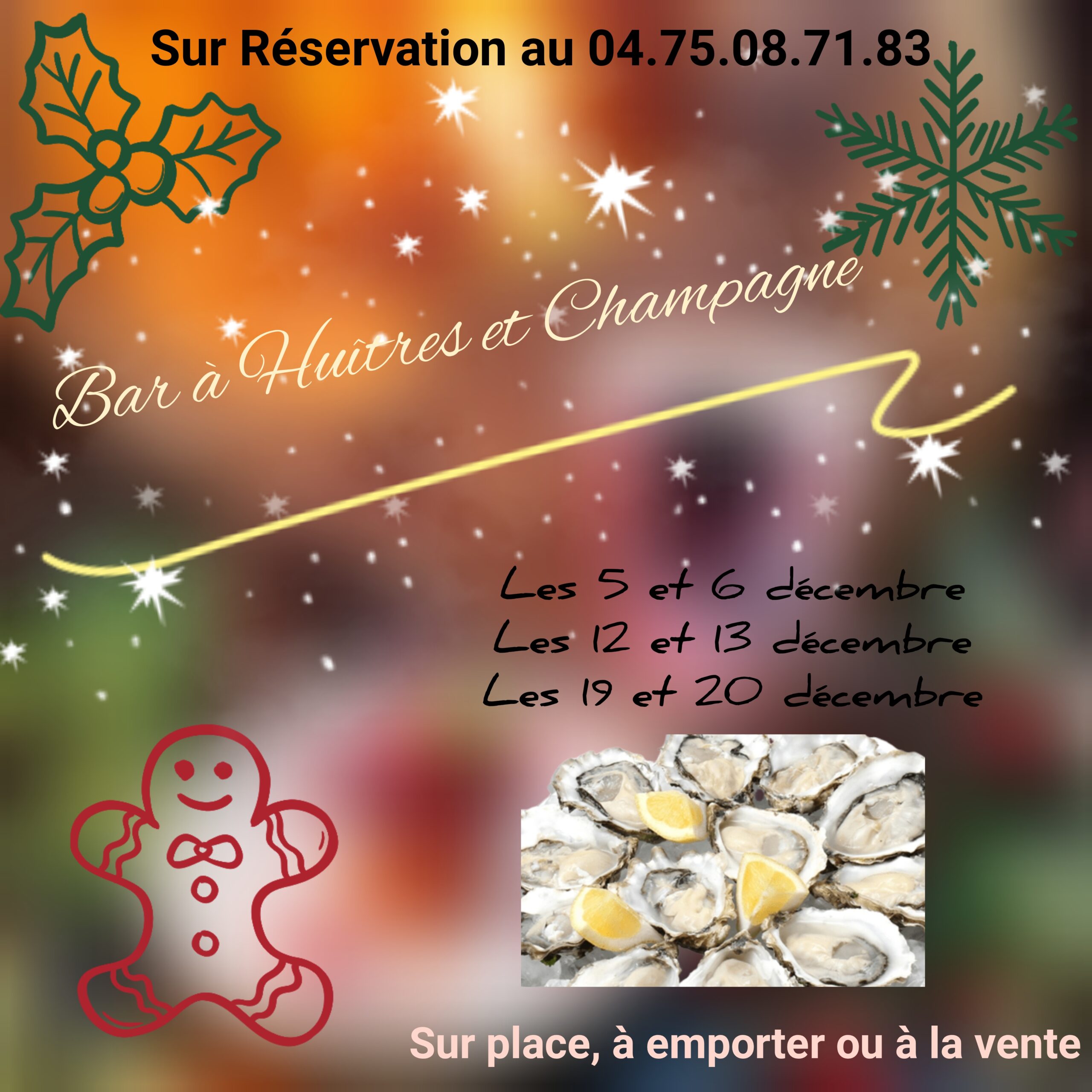 Sur place, à emporter, ou pour les huitres et le foie gras à la vente (04.75.08.71.83) jusqu’au 24 décembre inclus